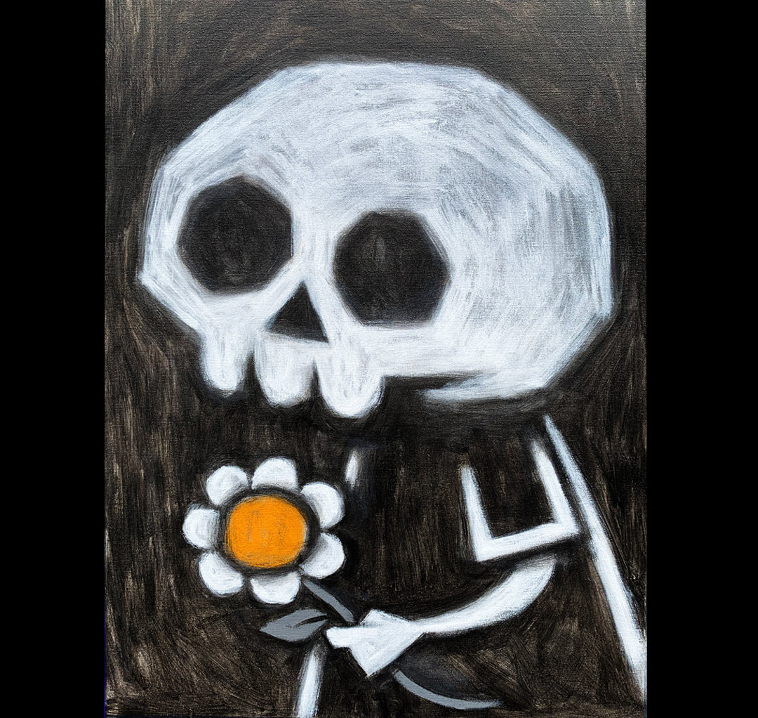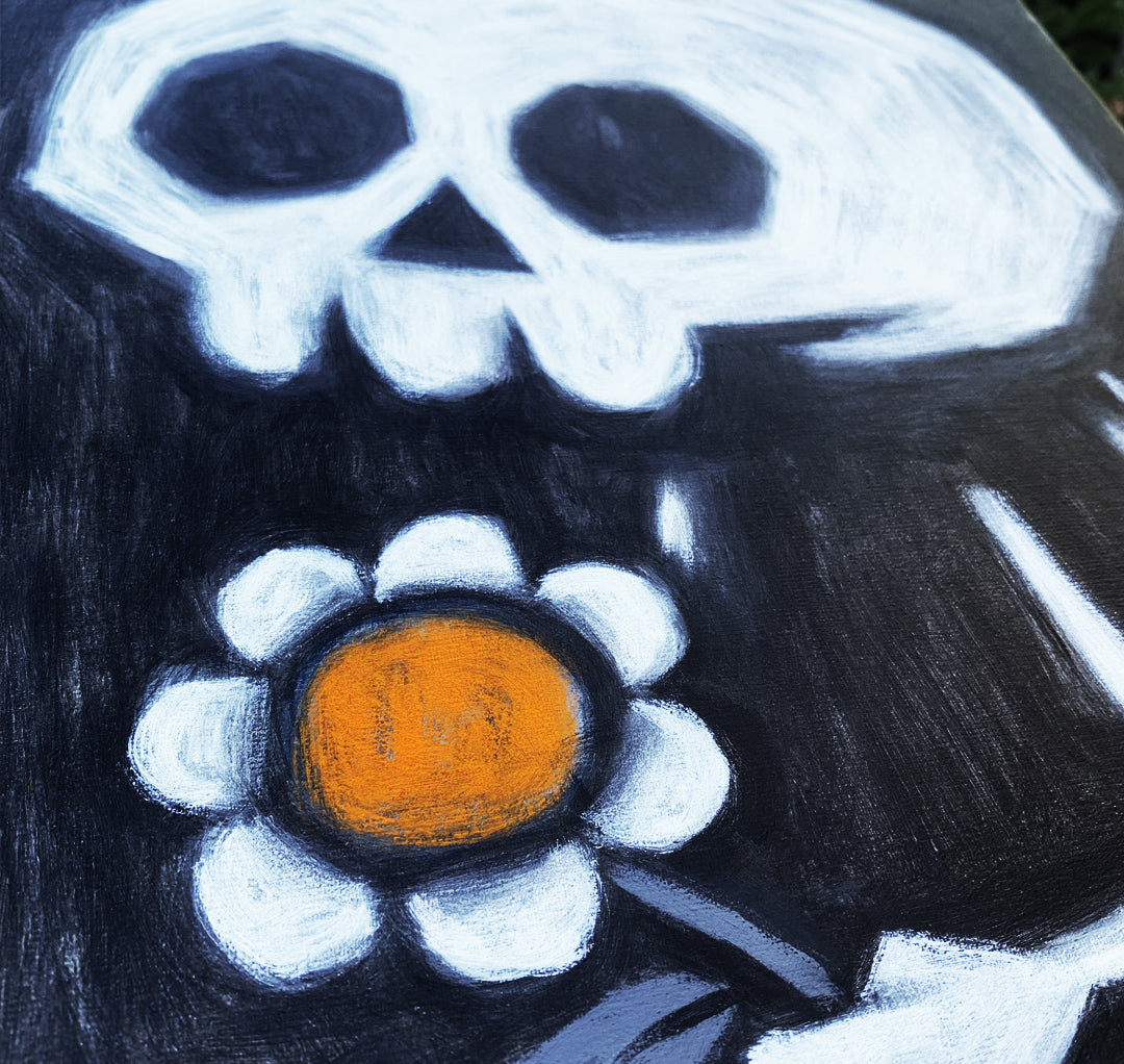 This is Joey's latest experiment. He started by using Akumu Ink stickers to create a textured base on the canvas. Then, the DeadBoy character was painted over it, creating a ghostly effect.