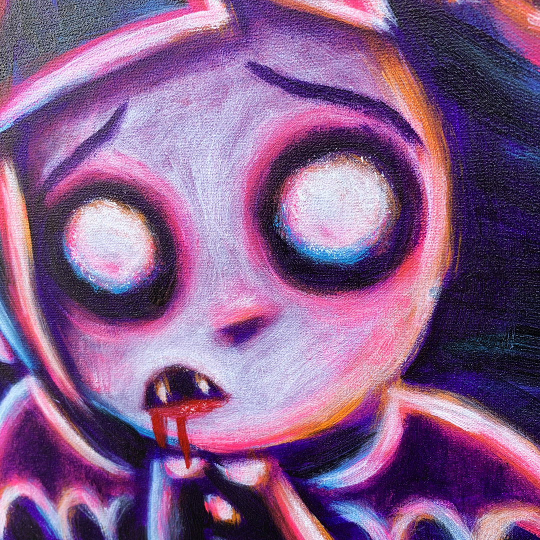 As the artist, my connection to this piece runs deep. It reflects my own inner duality—the choice to let go of a safer, more expected path in order to embrace something riskier, rawer, and more honest. Much like this character, I gave up something familiar in exchange for something more real. It’s a metaphor for my journey: from being a children’s book illustrator in Montreal, Canada, to co-founding Akumu Ink® with Aldora in 2008, to now painting from our studio in the Netherlands—where my creative evolution continues.