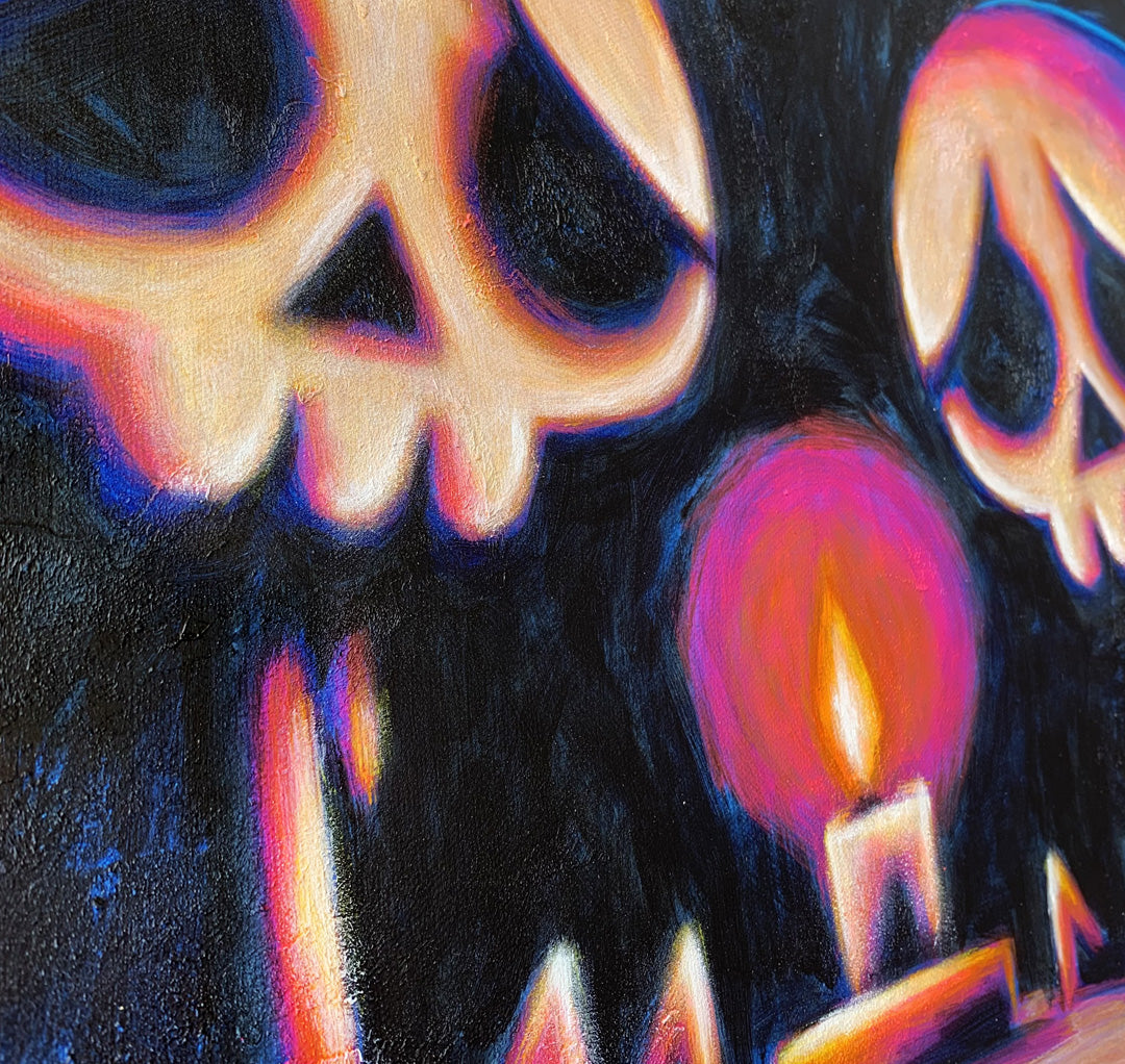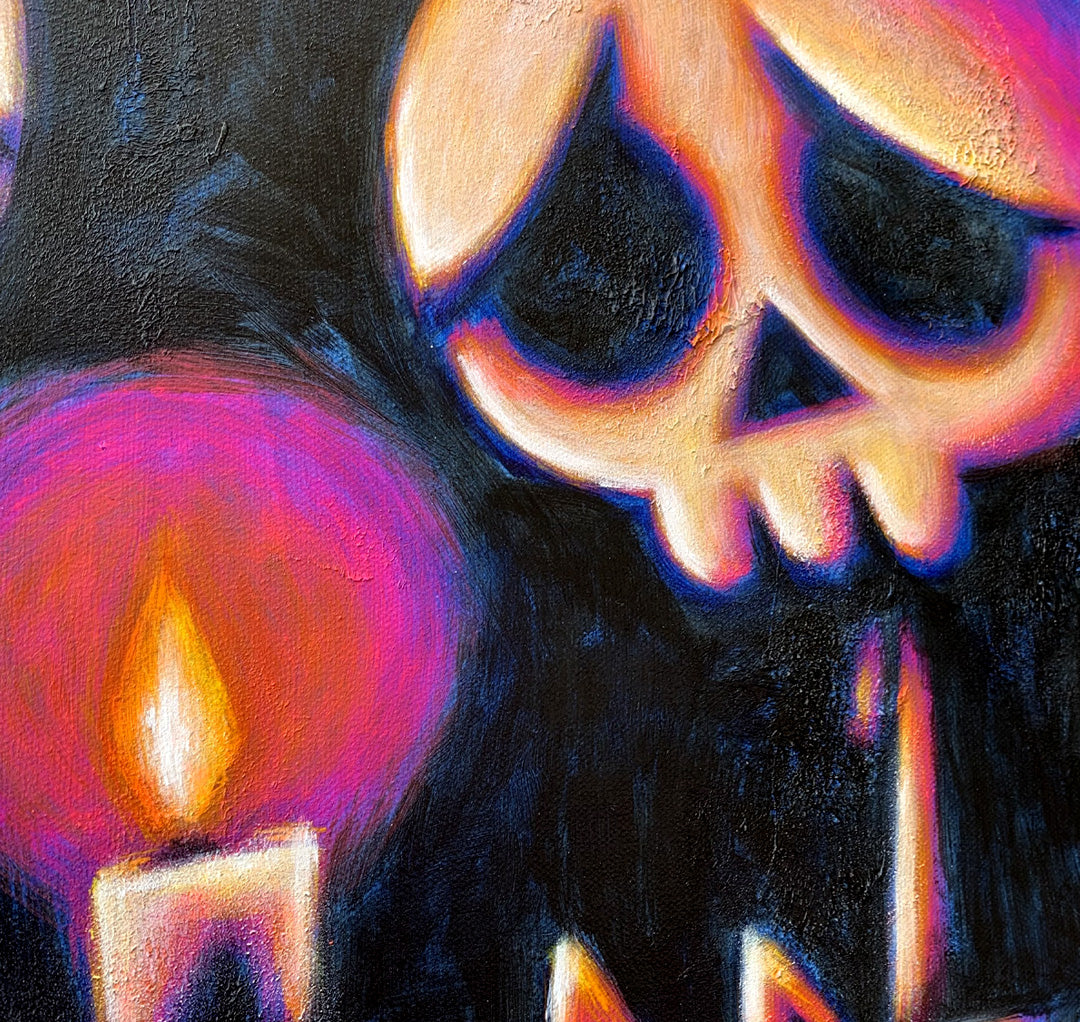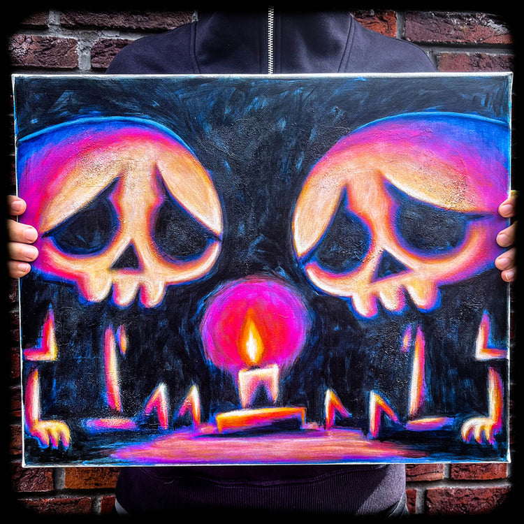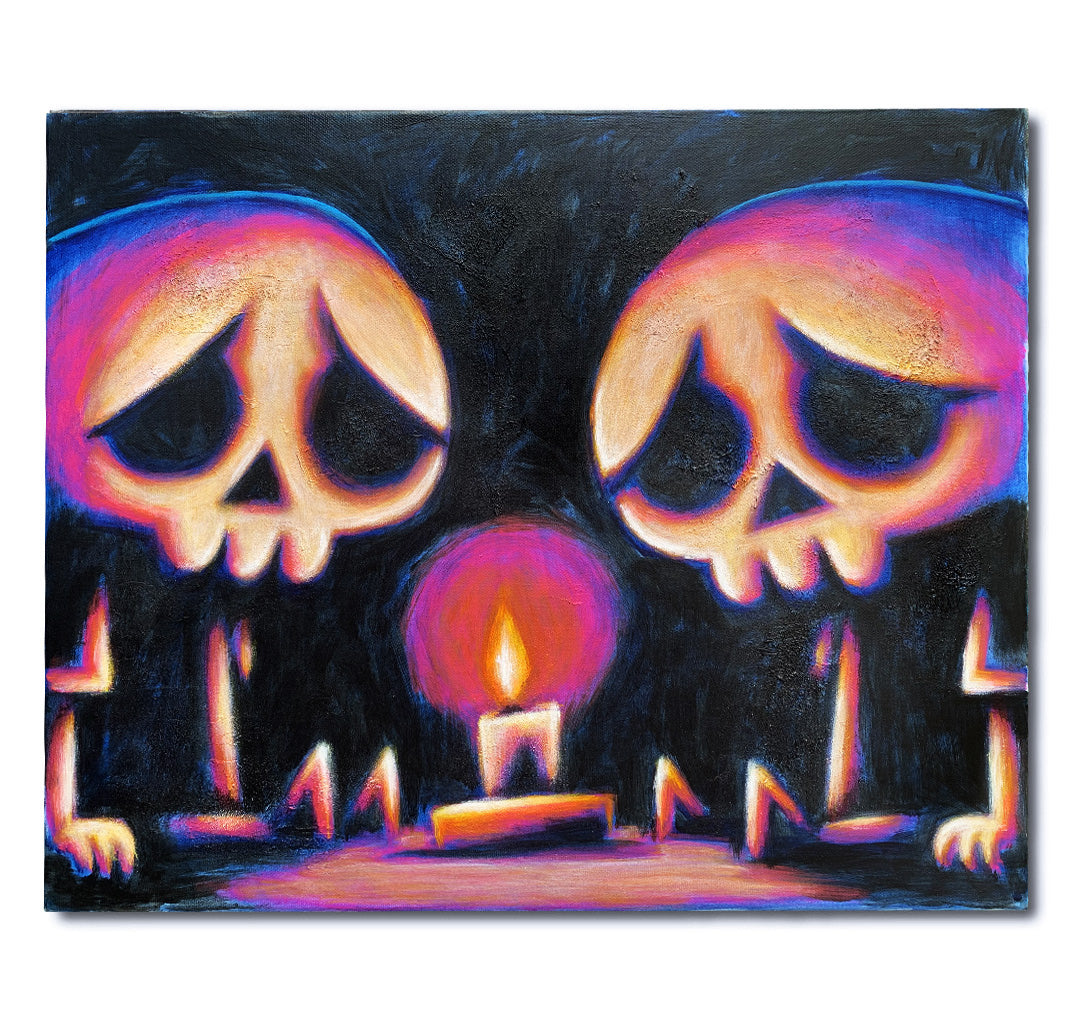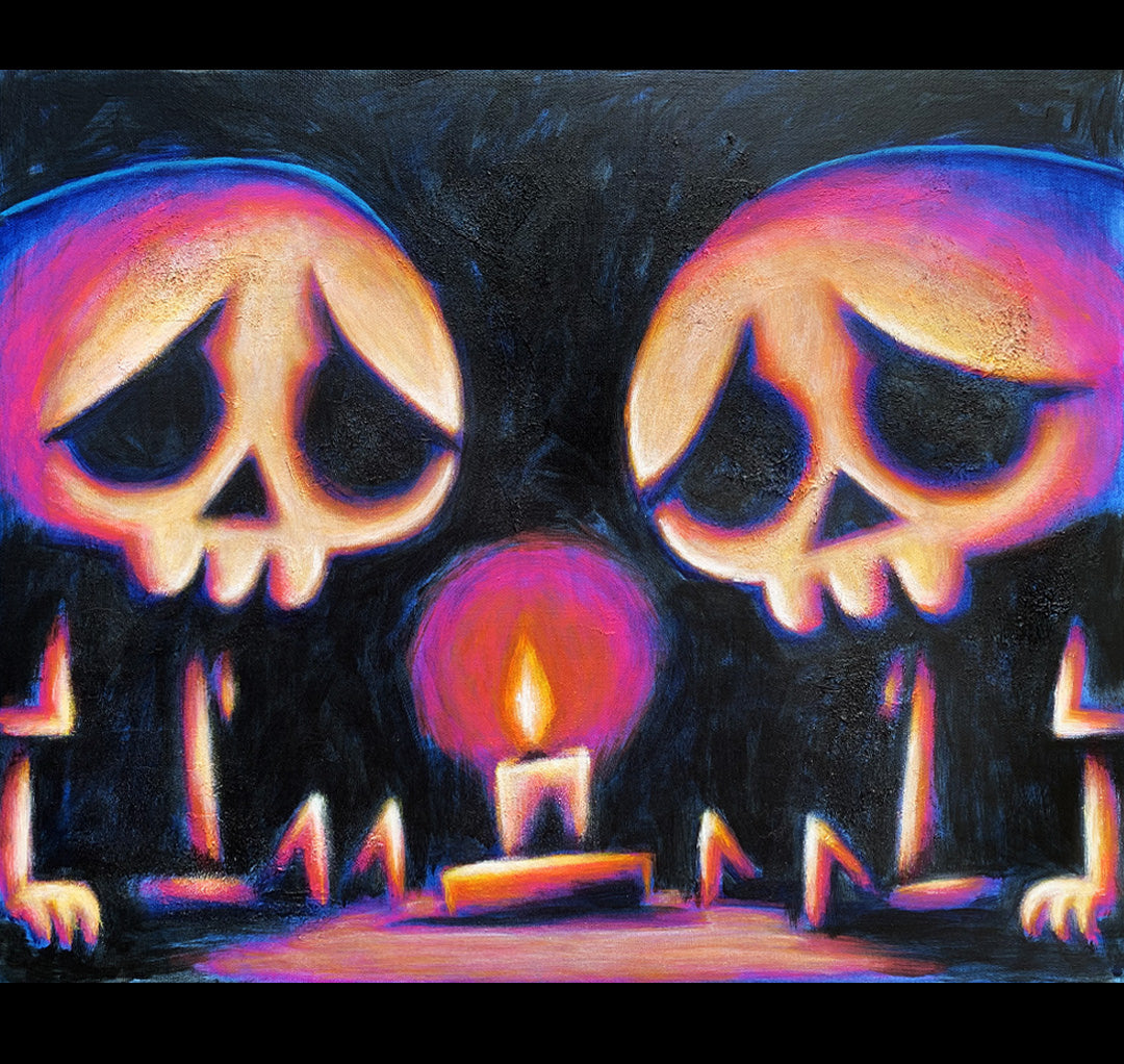 This acrylic painting is the third in an ongoing series exploring the complexity of human connection through my DeadBoy character. A continuation of Sitting By Myself, it portrays two skeletons sharing an intimate moment, unified by a single burning flame—a symbol of their bond. The flame, now central to this series, represents both the strength and fragility of relationships, and the quiet effort it takes to keep that connection alive. My process begins with a rough sketch to capture the feeling, followed by a freehand drawing directly onto the canvas. I then build the image layer by layer with acrylics, shaping mood through light and shadow. Though the figures are "dead", the emotions are raw and human. This piece reflects my fascination with the contradictions of love—its silence, its intensity, and its persistence even when everything else fades away.