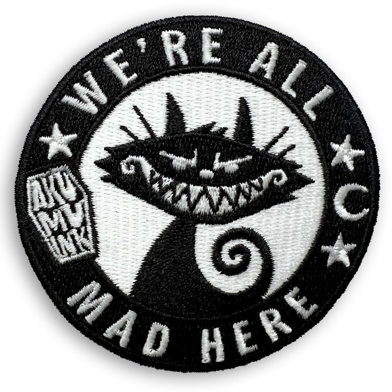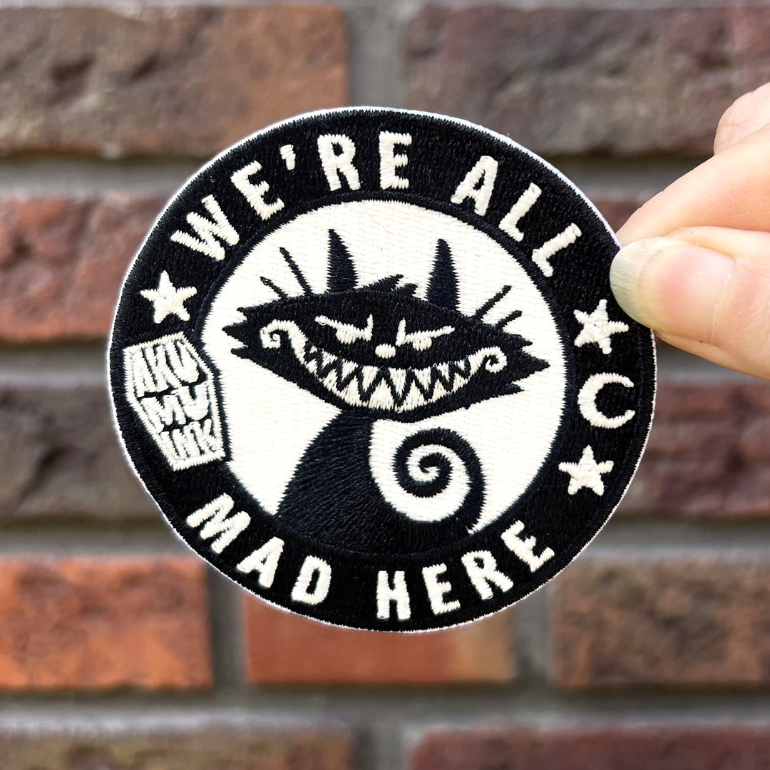 We're All Mad Here embroidered patch with iron-on backing. Size 7cm (3") high.
