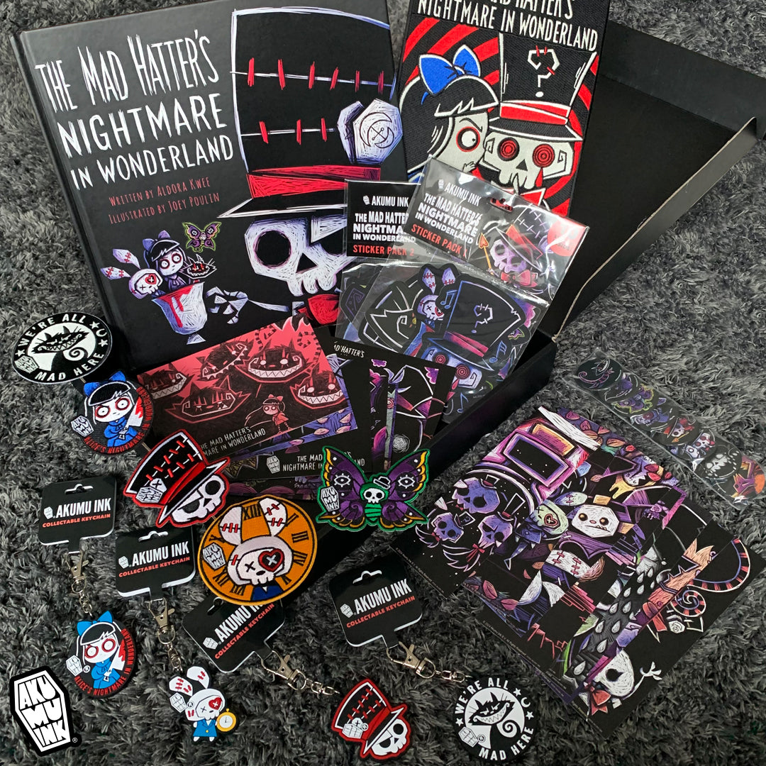The Mad Hatter's Nightmare in Wonderland is a visually captivating tale perfect for fans of horror and gothic art. It takes readers on a daring, dark journey through Wonderland, making it a must-read and a cause of enjoyment for those who seek another exciting version of terrors happening in Wonderland. Experience this haunting world for yourself—The Mad Hatter's Nightmare in Wonderland is available for purchase online with international shipping from the Netherlands; with the audio book as an add-on purchase option. Immerse yourself in this twisted, beautifully haunting story and join a community of readers who love a darker, more thrilling version of Wonderland. Written by Aldora Kwee, and illustrated by Joey Poulin, the creative minds and co-owners of Akumu Ink.