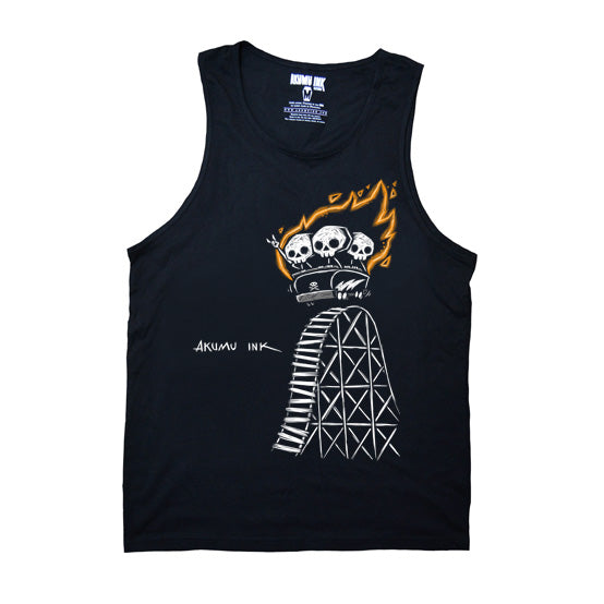 Our original hand-drawn artwork depicts skeletons at the peak of a fiery rollercoaster, seconds before the drop—symbolizing the chaos of a crumbling world. Titled "Enjoy the Ride," this emo gothic design embraces the inevitable descent, reminding us to brace ourselves as everything burns.