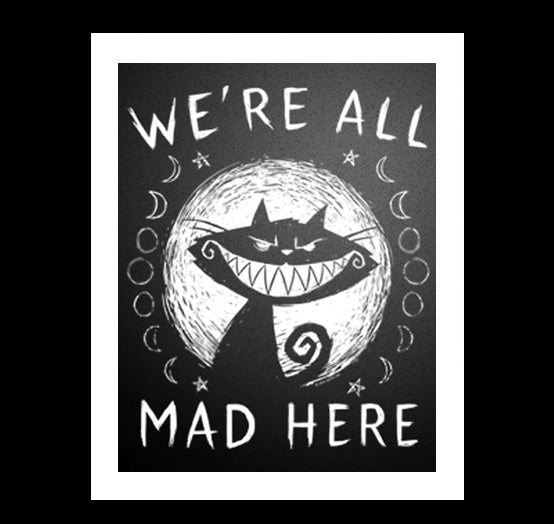 Original hand-drawn artwork of the Cheshire Cat sitting in front of a full moon with occult symbols of moon phases surrounding the design, and the words "We're All Mad Here."