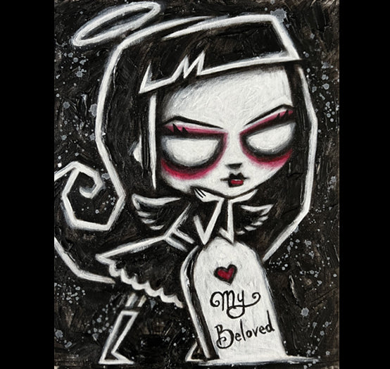 Original hand-drawn artwork of MY BELOVED, featuring a goth angel eavesdropping on the living while sharing stories about their beloved.
