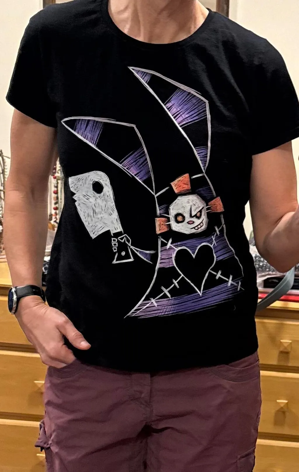 As for the image itself, I have a thing for creepy cute and specifically creepy bunnies. It looks just the same as on the website. I love it. The other moms give me sideways looks in the pick-up line at school but that's on them. This shirt is amazing! :)