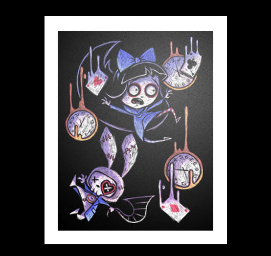 Original hand-drawn artwork of Down The Rabbit Hole. Both Alice and the White Rabbit fell into the infinite rabbit hole. Will they arrive at the same place? At the same time? Find out more from our book: Alice's Nightmare in Wonderland storybook