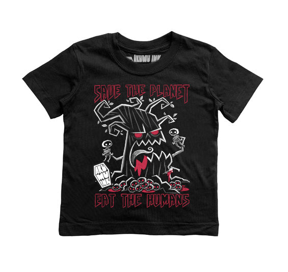 This design features a sinister tree devouring people while its roots drain their blood. With the thought-provoking message 'Save the Planet, Eat the Humans', this design advocates for environmental awareness with our dark humor. This statement piece will definitely spark conversation.