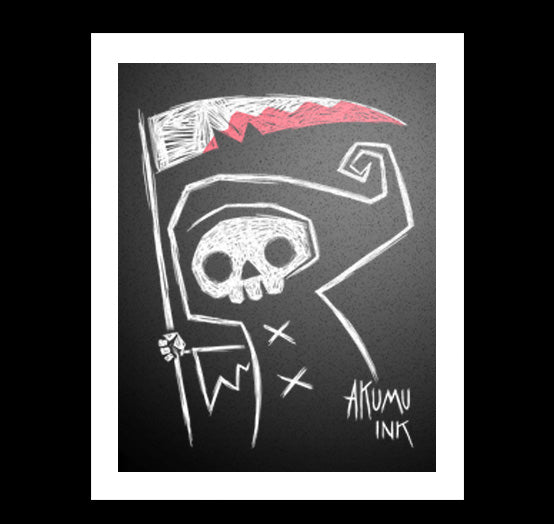 This design features hand-drawn artwork of the Grim Reaper holding his iconic scythe. Embrace the timeless symbol of mortality with this striking design.