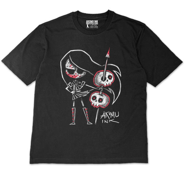 This design features hand-drawn artwork of our Japanese schoolgirl character, Tokyo Chan, standing fearlessly with two skulls mounted on a pike. Combining elements of dark anime style and gothic horror, this striking illustration captures beauty, brutality, and rebellion in a single scene.